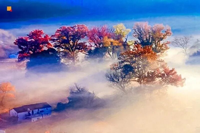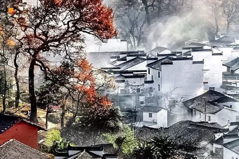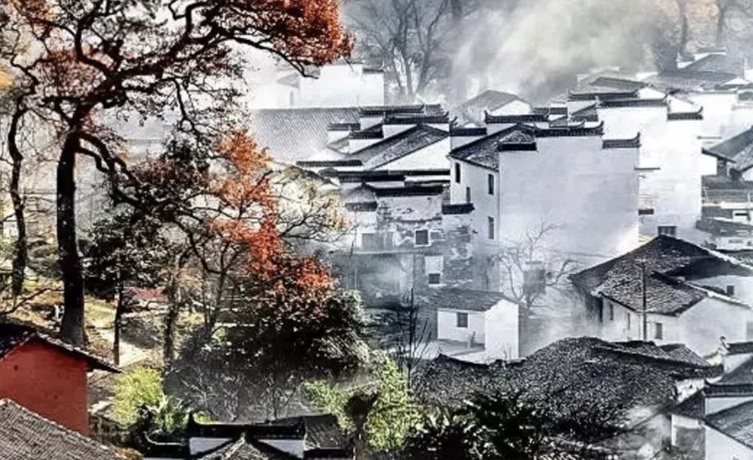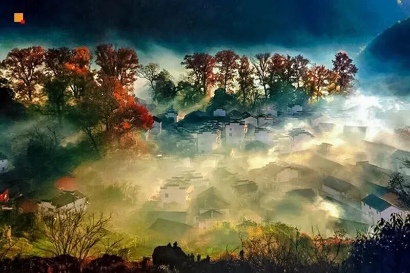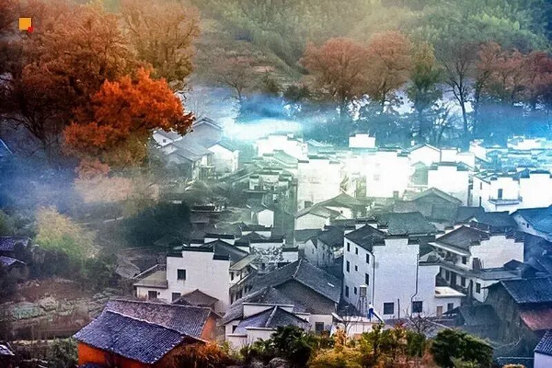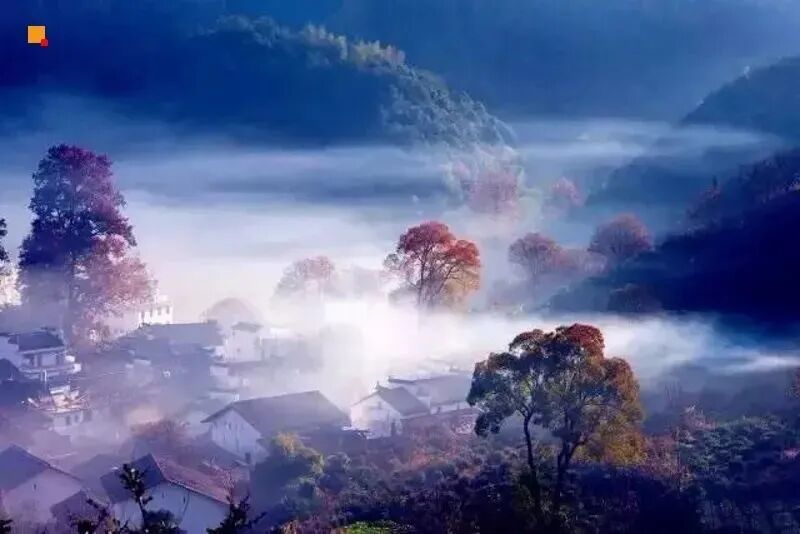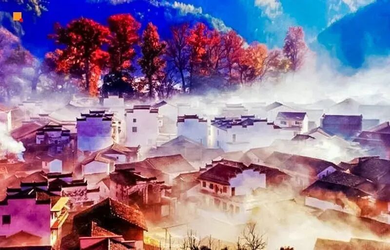 3、石城晨雾:被晨雾缭绕的人间仙境,婺源的石城也被称之为“枫林观景区”,枫树群染上一片红色,在晨雾与炊烟得笼罩下,构成了如梦幻般的仙境。