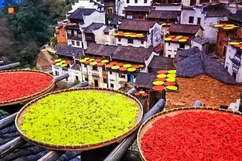 2、篁岭晒秋:每年秋季,整个山间、房屋、晒架上,都是五彩缤纷的丰收果实,看似平淡的淳朴民风景象,却是让人最感动暖心的一幕。