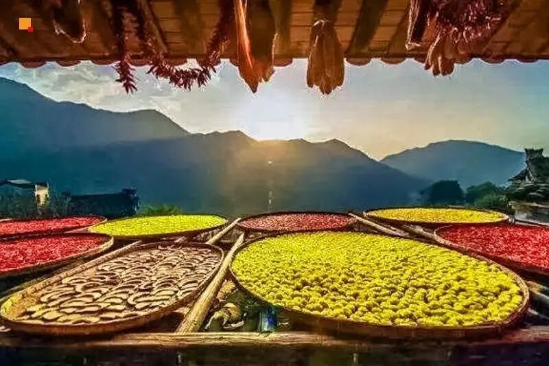 10:00  | 【篁岭晒秋】挂在山崖上的篁岭古村,“地无三尺平”,数百栋徽派民居在百米落差的坡面错落排布,每当日出山头,晨曦映照,整个山间房屋晒架上五彩缤纷的丰收果实,绘就出美丽的“晒秋”农俗景观。春晒茶叶、夏晒山蕨、秋晒果蔬、冬晒乡俗……一年四季延绵有续。“晒秋”是篁岭古村500年来延续至今的晒谷物特色民俗景象。它反映了以篁岭为代表的山居民众原生态的晒物农俗,是劳动人民对丰收喜庆和未来生活所赋予的质朴美好的期待,并逐渐沉积为一种民俗和文化  |