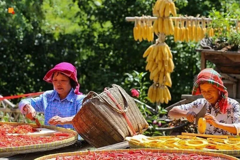 家家户户的房顶晒架上,都铺满了辣椒、夏菊、玉米、稻谷……充满着绚烂的色彩。