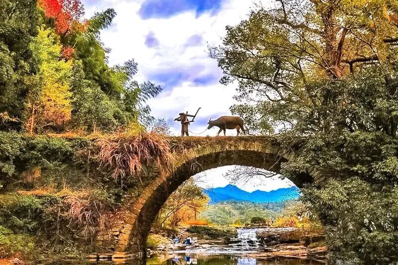 10:00  | 拍摄完石城后,我们前往『菊径村』游览。 菊径村是个典型的山环水绕型村庄,小河成大半圆型,绕村庄将近一周,四周为高山环绕。上了村庄对面的小山坡在半山腰处就见到整个菊径村,一条小溪圆圆地环绕整个小村,小溪与公路的连接是一座座小木桥,整个村子一面靠山,很符合中国的八卦“后山前水”设计。 - 适时集合,我们前往『虹关村-察关村』游览。 虹关村建村于南宋建炎年间,明清时有墨铺80余家。村头有千年古樟,高26.1米,直径3.4米,冠幅达3亩,有“江南第一樟”之誉。是北线的精华景点,从清华出发,经浙源,虹关一线,沿途都是未开发的村庄,可以看到原汁原味的乡村田园风光。 察关村迄今一千二百余年;是巴金先生的好友詹剑峰先生故里。这里背靠青山,山下清晰的溪河,溪河上有一座古桥,古桥上老汉放牛成为当地特色的人文景观。很多摄影爱好者都要到此地拍摄:老人身披蓑衣,头戴草帽牵牛过河的经典场面!到时候我们也会给大家安排一场,大家可以尽情拍摄!  |
